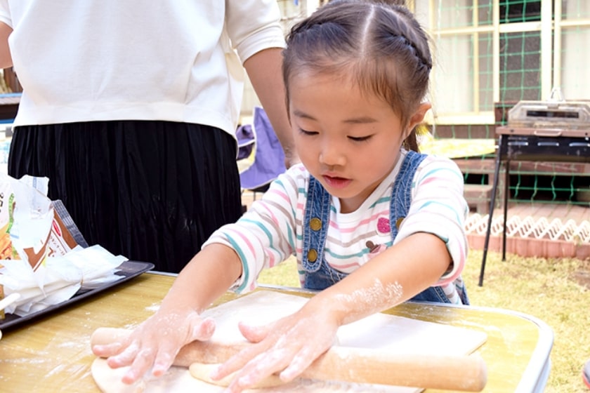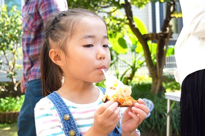 キャンプはもちろん、SUP(サップ)をしたり、時には愛娘の紗彩ちゃんを背負って登山に行ったりと、家族みんなで地元・今治を満喫しています。日当たりのいい庭ではバーベキューやピザパーティーを行うこともあり、今回も紗彩ちゃんは走り回りながら「ピッザ~♪ ピッザ~♪」と大はしゃぎ。もっとも食べるよりも作る方が好きなようで、ママの助けを借りながらせっせと盛り付けていました。