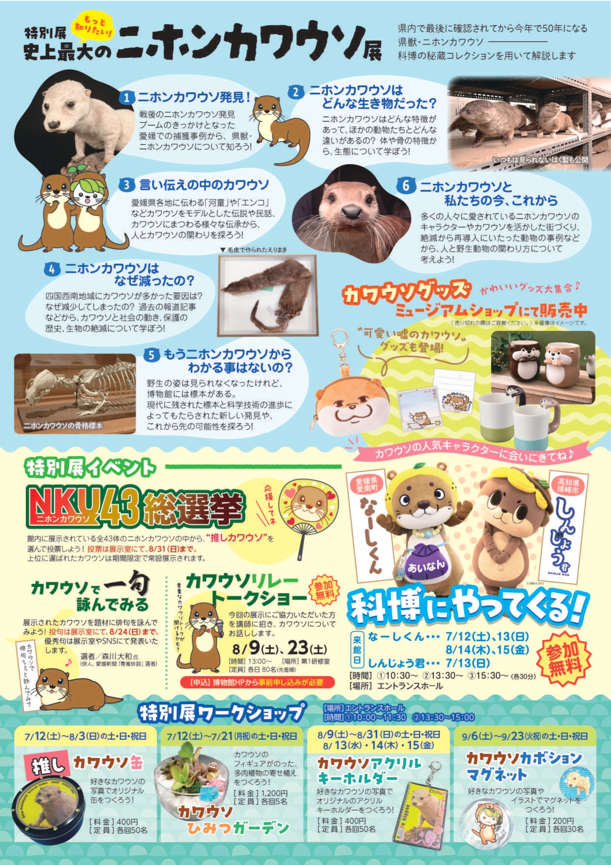 この特別展では県内で最後に確認されてから50年になるニホンカワウソについて、生物としての特徴や人々との関わりなどについて解説します。展示室内では、科博の秘蔵コレクションを一挙公開!特別展期間中には、館内に展示されている全43体のニホンカワウソの中から推しカワウソを選んで投票するイベント「NKU43総選挙」や好きなカワウソの写真でオリジナル缶やアクリルキーホルダーをつくる特別展関連ワークショップなど多数開催します。詳しくは、博物館HPをご確認ください。
