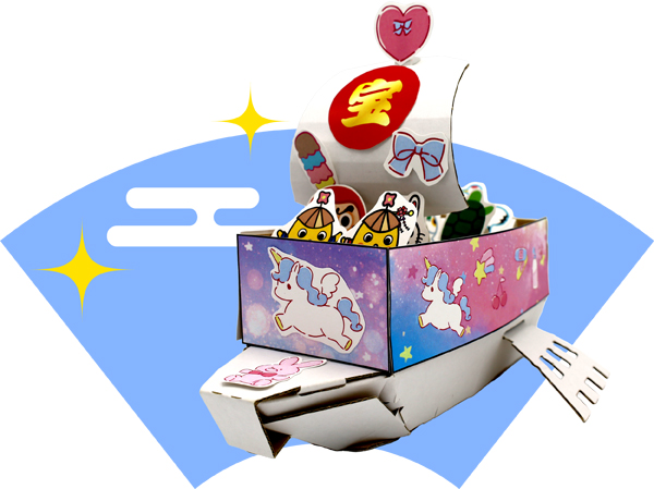 段ボールを組み立てて船を作り、飾り付けをします。新年にぴったりな縁起の良い「宝船」をつくれます。