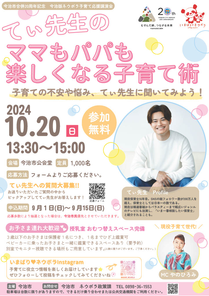 今治で子育てをする市民を応援し、地域全体で支える機運を醸成するため、子育てに役立つ情報を提供できる親子で楽しめる講演会を実施します。