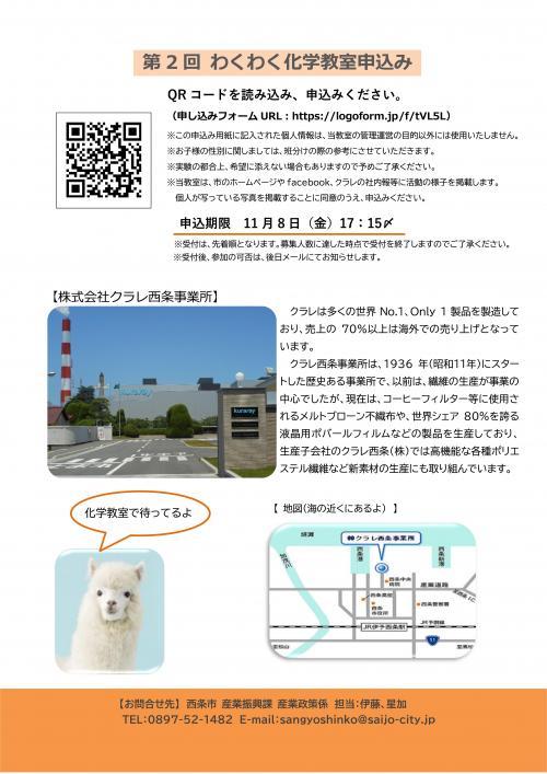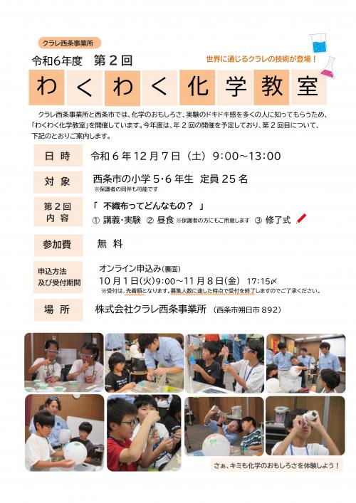 株式会社クラレ西条事業所と西条市では、化学のおもしろさ、実験のドキドキ感を多くの方に知ってもらうため、「わくわく化学教室」を開催します。