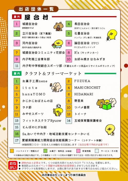 令和にリニューアルして復活した『内子東自治センターまつり』も今年で3回目。今回は管内すべての自治会のほか内子町で活躍されているみなさん・事業所など28のブースで盛り上げていただきます!