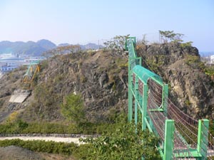 黒島海浜公園展望広場にネット遊具で渡ります。結構高さがあって、岩場を登っていくのでスリル満点です。