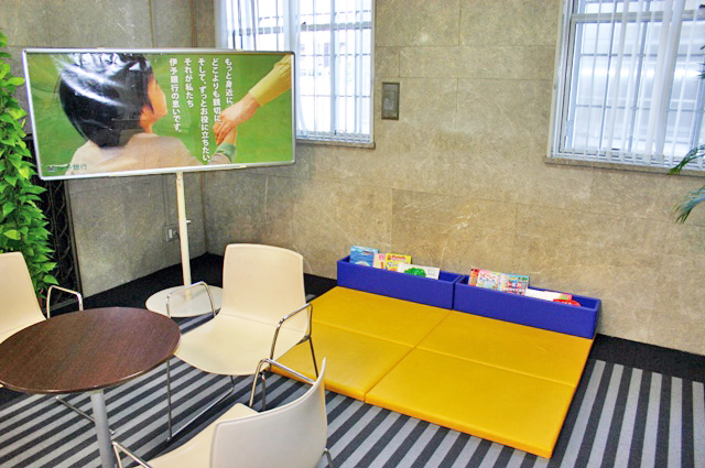 イヨギンコウ ホンテンエイギョウブ本店営業部には、お子様と一緒に安心してくつろげるコーナーがございます。こちらでは、お子様と絵本も楽しんでいただけます。行員一同、みなさまのご来店を心よりお待ちしております。