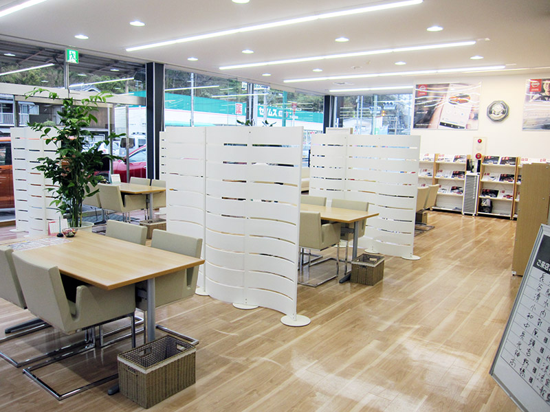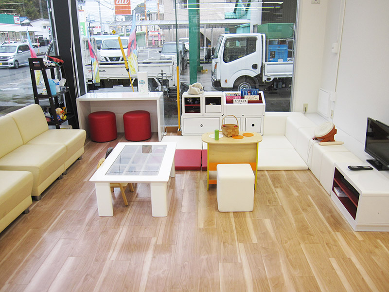 エヒメニッサンジドウシャ ウワジマワレイテン当店はキッズスペースを、ショールーム内のどこからでも目の届くところに設置し、保護者の方が安心して商談できるようにしております。おもちゃも充実しており、お子様に楽しく遊んでいただけます。また安全面にもスタッフ一同配慮しております。これからもご家族みなさまで過ごしやすいショールームを目ざしていきたいと思います。