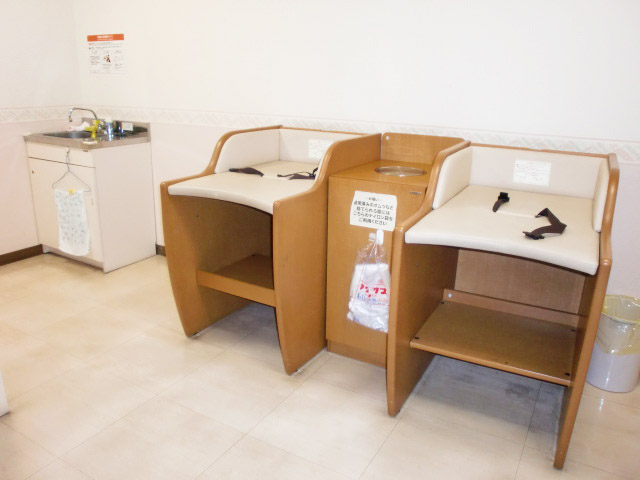 ○休憩室にオムツ交換コーナーと授乳スペースあり。