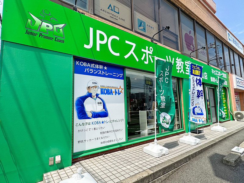 ジェーピーシースポーツキョウシツマツヤマテン楽しく遊びながら体幹を鍛えるスポーツ教室です。数多の著名なスポーツ選手が行っている『KOBA式体幹★バランス』を取り入れており、早い段階から体幹や運動神経系を鍛えることで、運動能力の向上はもちろんのこと学習やゲーム等で猫背になりがちなお子様の姿勢改善・予防に繋がります。